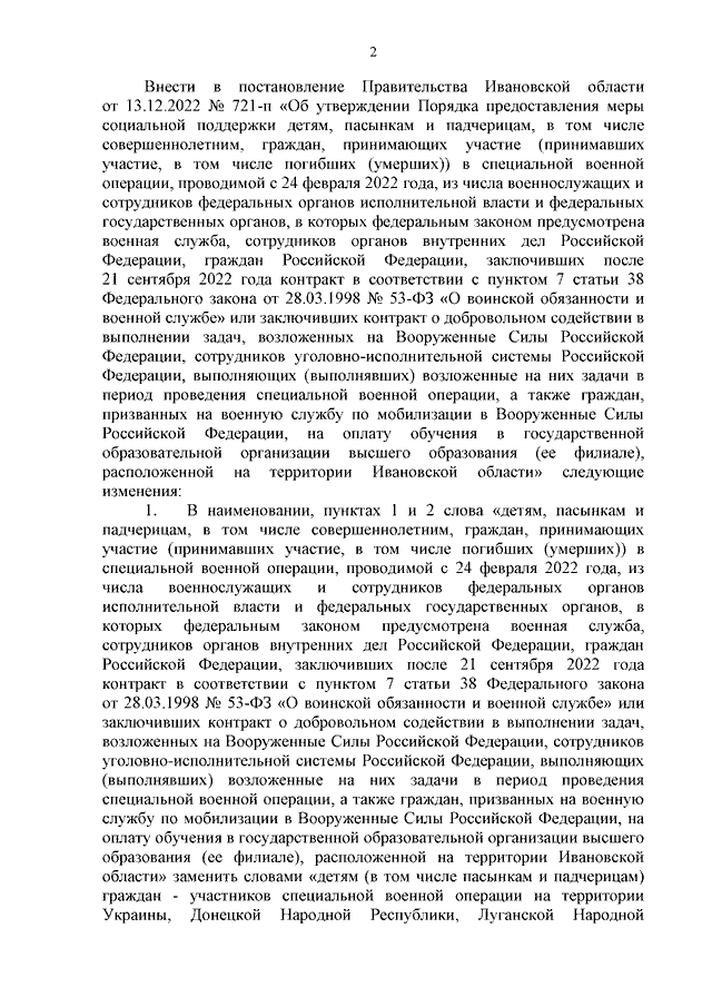 Постановление Правительства Ивановской области от 23.04.2025 N 158-п "О внесении изменений в постановление Правительства Ивановской области от 13.12.2022 N 721-п "Об утверждении Порядка предоставления меры социальной поддержки детям, пасынкам и падчерицам, в том числе совершеннолетним, граждан, принимающих участие (принимавших участие, в том числе погибших (умерших)) в специальной военной операции, проводимой с 24 февраля 2022 года, из числа военнослужащих и сотрудников федеральных органов исполнительной власти и федеральных государственных органов, в которых федеральным законом предусмотрена военная служба, сотрудников органов внутренних дел Российской Федерации, граждан Российской Федерации, заключивших после 21 сентября 2022 года контракт в соответствии с пунктом 7 статьи 38 Федерального закона от 28.03.1998 N 53-ФЗ "О воинской обязанности и военной службе" или заключивших контракт о добровольном содействии в выполнении задач, возложенных на Вооруженные Силы Российской Федерации, сотрудников уголовно-исполнительной системы Российской Федерации, выполняющих (выполнявших) возложенные на них задачи в период проведения специальной военной операции, а также граждан, призванных на военную службу по мобилизации в Вооруженные Силы Российской Федерации, на оплату обучения в государственной образовательной организации высшего образования (ее филиале), расположенной на территории Ивановской области"