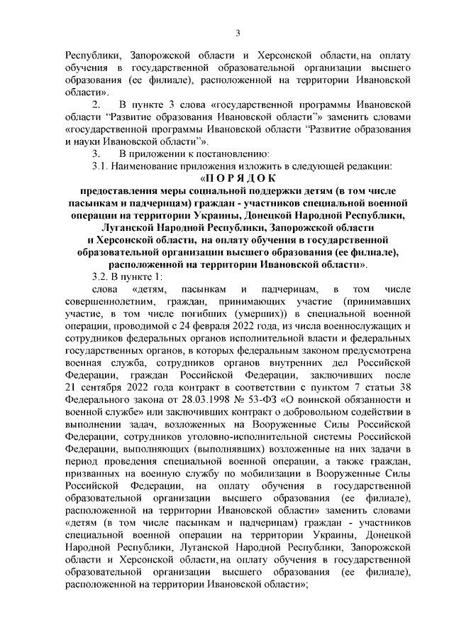 Постановление Правительства Ивановской области от 23.04.2025 N 158-п "О внесении изменений в постановление Правительства Ивановской области от 13.12.2022 N 721-п "Об утверждении Порядка предоставления меры социальной поддержки детям, пасынкам и падчерицам, в том числе совершеннолетним, граждан, принимающих участие (принимавших участие, в том числе погибших (умерших)) в специальной военной операции, проводимой с 24 февраля 2022 года, из числа военнослужащих и сотрудников федеральных органов исполнительной власти и федеральных государственных органов, в которых федеральным законом предусмотрена военная служба, сотрудников органов внутренних дел Российской Федерации, граждан Российской Федерации, заключивших после 21 сентября 2022 года контракт в соответствии с пунктом 7 статьи 38 Федерального закона от 28.03.1998 N 53-ФЗ "О воинской обязанности и военной службе" или заключивших контракт о добровольном содействии в выполнении задач, возложенных на Вооруженные Силы Российской Федерации, сотрудников уголовно-исполнительной системы Российской Федерации, выполняющих (выполнявших) возложенные на них задачи в период проведения специальной военной операции, а также граждан, призванных на военную службу по мобилизации в Вооруженные Силы Российской Федерации, на оплату обучения в государственной образовательной организации высшего образования (ее филиале), расположенной на территории Ивановской области"