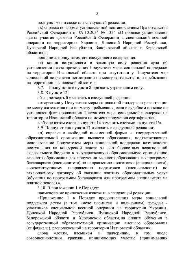 Постановление Правительства Ивановской области от 23.04.2025 N 158-п "О внесении изменений в постановление Правительства Ивановской области от 13.12.2022 N 721-п "Об утверждении Порядка предоставления меры социальной поддержки детям, пасынкам и падчерицам, в том числе совершеннолетним, граждан, принимающих участие (принимавших участие, в том числе погибших (умерших)) в специальной военной операции, проводимой с 24 февраля 2022 года, из числа военнослужащих и сотрудников федеральных органов исполнительной власти и федеральных государственных органов, в которых федеральным законом предусмотрена военная служба, сотрудников органов внутренних дел Российской Федерации, граждан Российской Федерации, заключивших после 21 сентября 2022 года контракт в соответствии с пунктом 7 статьи 38 Федерального закона от 28.03.1998 N 53-ФЗ "О воинской обязанности и военной службе" или заключивших контракт о добровольном содействии в выполнении задач, возложенных на Вооруженные Силы Российской Федерации, сотрудников уголовно-исполнительной системы Российской Федерации, выполняющих (выполнявших) возложенные на них задачи в период проведения специальной военной операции, а также граждан, призванных на военную службу по мобилизации в Вооруженные Силы Российской Федерации, на оплату обучения в государственной образовательной организации высшего образования (ее филиале), расположенной на территории Ивановской области"