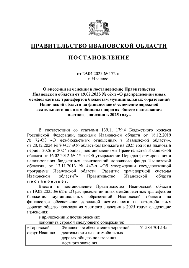 Постановление Правительства Ивановской области от 29.04.2025 N 172-п "О внесении изменений в постановление Правительства Ивановской области от 19.02.2025 N 62-п "О распределении иных межбюджетных трансфертов бюджетам муниципальных образований Ивановской области на финансовое обеспечение дорожной деятельности на автомобильных дорогах общего пользования местного значения в 2025 году"