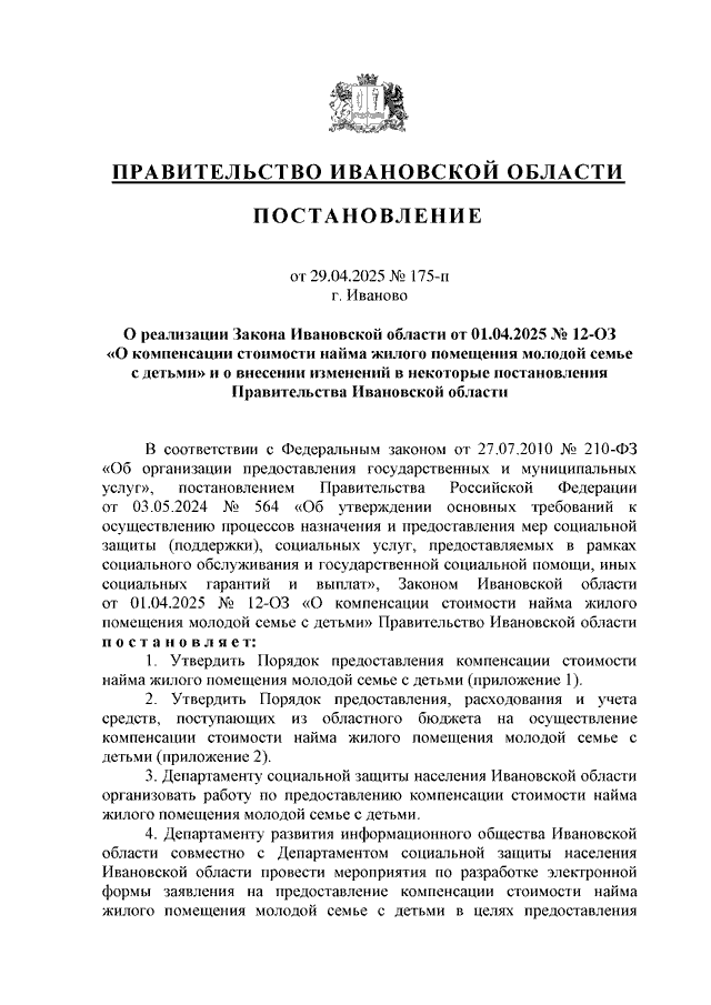 Постановление Правительства Ивановской области от 29.04.2025 N 175-п "О реализации Закона Ивановской области от 01.04.2025 N 12-ОЗ "О компенсации стоимости найма жилого помещения молодой семье с детьми" и о внесении изменений в некоторые постановления Правительства Ивановской области" (вместе с "Порядком предоставления компенсации стоимости найма жилого помещения молодой семье с детьми", "Порядком предоставления, расходования и учета средств, поступающих из областного бюджета на осуществление компенсации стоимости найма жилого помещения молодой семье с детьми")