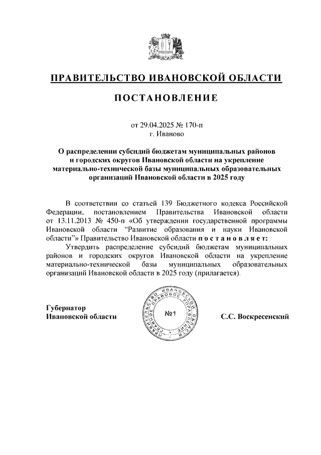 Постановление Правительства Ивановской области от 29.04.2025 N 170-п "О распределении субсидий бюджетам муниципальных районов и городских округов Ивановской области на укрепление материально-технической базы муниципальных образовательных организаций Ивановской области в 2025 году"