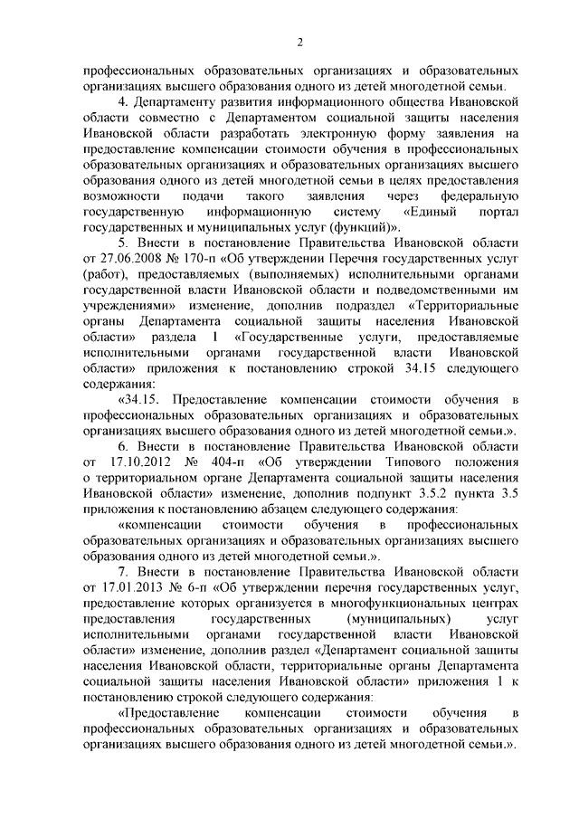 Постановление Правительства Ивановской области от 29.04.2025 N 174-п "О реализации Закона Ивановской области от 01.04.2025 N 10-ОЗ "О компенсации стоимости обучения в профессиональных образовательных организациях и образовательных организациях высшего образования одного из детей многодетной семьи" и о внесении изменений в некоторые постановления Правительства Ивановской области" (вместе с "Порядком предоставления компенсации стоимости обучения в профессиональных образовательных организациях и образовательных организациях высшего образования одного из детей многодетной семьи", "Порядком предоставления, расходования и учета средств, поступающих из областного бюджета на осуществление компенсации стоимости обучения в профессиональных образовательных организациях и образовательных организациях высшего образования одного из детей многодетной семьи")