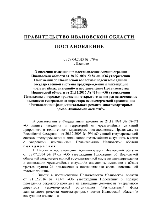 Постановление Правительства Ивановской области от 29.04.2025 N 179-п "О внесении изменений в постановление Администрации Ивановской области от 28.07.2004 N 84-па "Об утверждении Положения об Ивановской областной подсистеме единой государственной системы предупреждения и ликвидации чрезвычайных ситуаций" и постановление Правительства Ивановской области от 21.12.2016 N 423-п "Об утверждении Положения о порядке проведения открытого конкурса на замещение должности генерального директора некоммерческой организации "Региональный фонд капитального ремонта многоквартирных домов Ивановской области"
