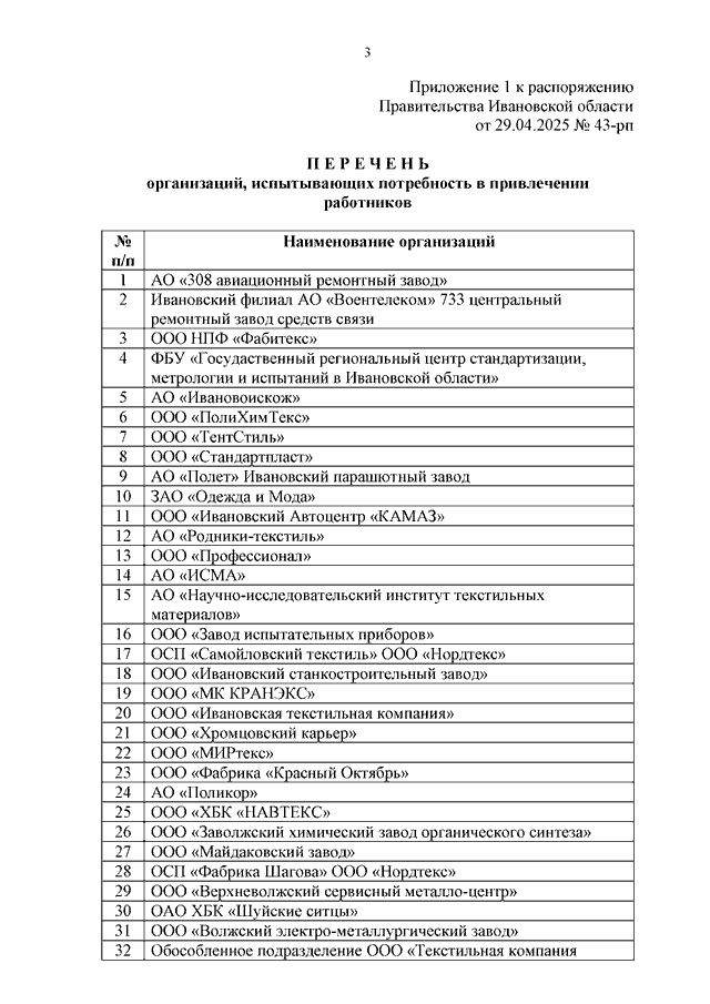 Распоряжение Правительства Ивановской области от 29.04.2025 N 43-рп "Об утверждении перечня организаций, испытывающих потребность в привлечении работников, и перечня приоритетных отраслей экономики в целях организации мероприятий в рамках реализации федерального проекта "Активные меры содействия занятости" национального проекта "Кадры"