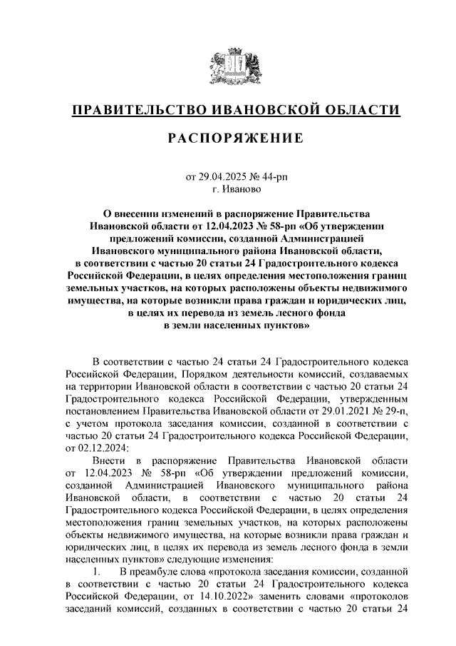 Распоряжение Правительства Ивановской области от 29.04.2025 N 44-рп "О внесении изменений в распоряжение Правительства Ивановской области от 12.04.2023 N 58-рп "Об утверждении предложений комиссии, созданной Администрацией Ивановского муниципального района Ивановской области, в соответствии с частью 20 статьи 24 Градостроительного кодекса Российской Федерации, в целях определения местоположения границ земельных участков, на которых расположены объекты недвижимого имущества, на которые возникли права граждан и юридических лиц, в целях их перевода из земель лесного фонда в земли населенных пунктов"