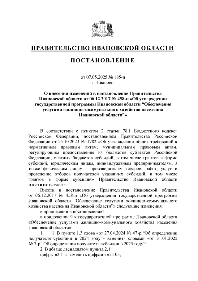 Постановление Правительства Ивановской области от 07.05.2025 N 185-п "О внесении изменений в постановление Правительства Ивановской области от 06.12.2017 N 458-п "Об утверждении государственной программы Ивановской области "Обеспечение услугами жилищно-коммунального хозяйства населения Ивановской области"