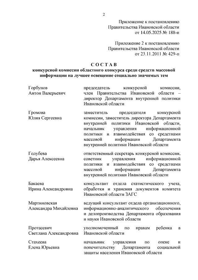 Постановление Правительства Ивановской области от 14.05.2025 N 188-п "О внесении изменения в постановление Правительства Ивановской области от 23.11.2011 N 429-п "О проведении ежегодного областного конкурса среди средств массовой информации на лучшее освещение социально значимых тем"