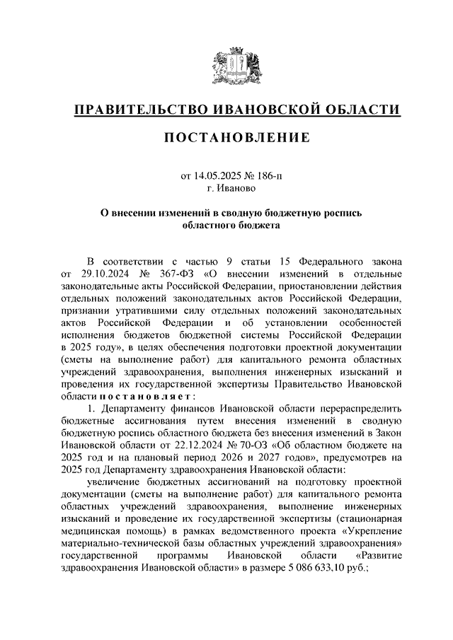 Постановление Правительства Ивановской области от 14.05.2025 N 186-п "О внесении изменений в сводную бюджетную роспись областного бюджета"