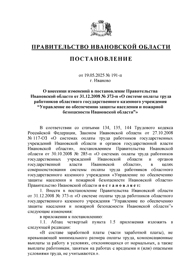 Постановление Правительства Ивановской области от 19.05.2025 N 191-п "О внесении изменений в постановление Правительства Ивановской области от 31.12.2008 N 373-п "О системе оплаты труда работников областного государственного казенного учреждения "Управление по обеспечению защиты населения и пожарной безопасности Ивановской области"