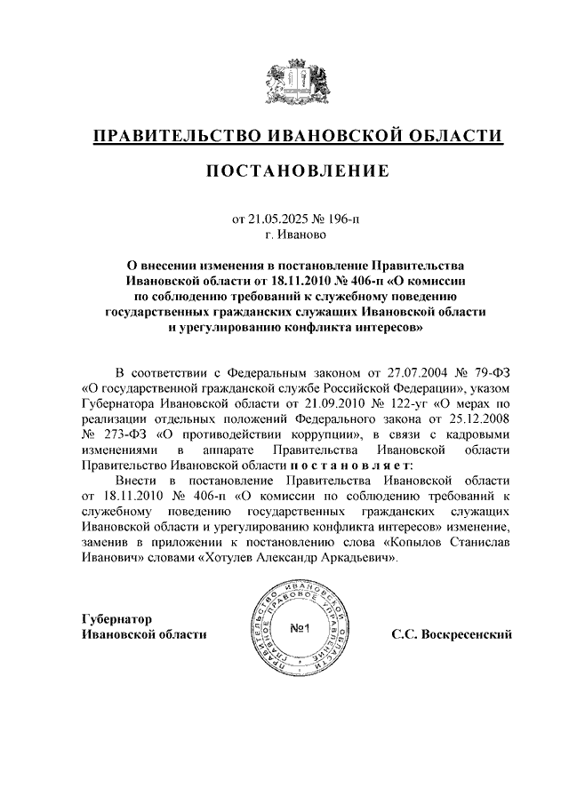 Постановление Правительства Ивановской области от 21.05.2025 N 196-п "О внесении изменения в постановление Правительства Ивановской области от 18.11.2010 N 406-п "О комиссии по соблюдению требований к служебному поведению государственных гражданских служащих Ивановской области и урегулированию конфликта интересов"