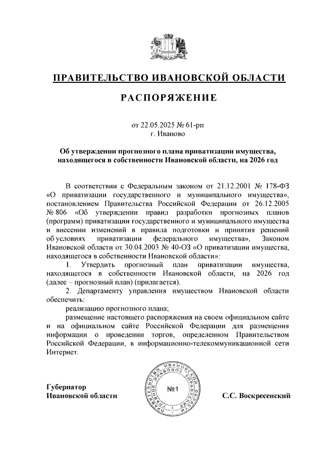 Распоряжение Правительства Ивановской области от 22.05.2025 N 61-рп "Об утверждении прогнозного плана приватизации имущества, находящегося в собственности Ивановской области, на 2026 год"