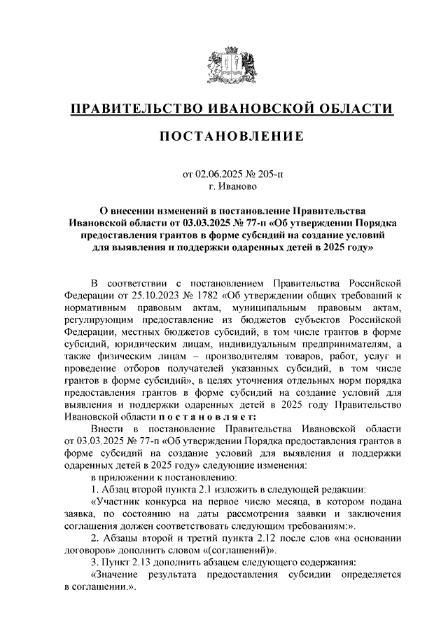 Постановление Правительства Ивановской области от 02.06.2025 N 205-п "О внесении изменений в постановление Правительства Ивановской области от 03.03.2025 N 77-п "Об утверждении Порядка предоставления грантов в форме субсидий на создание условий для выявления и поддержки одаренных детей в 2025 году"