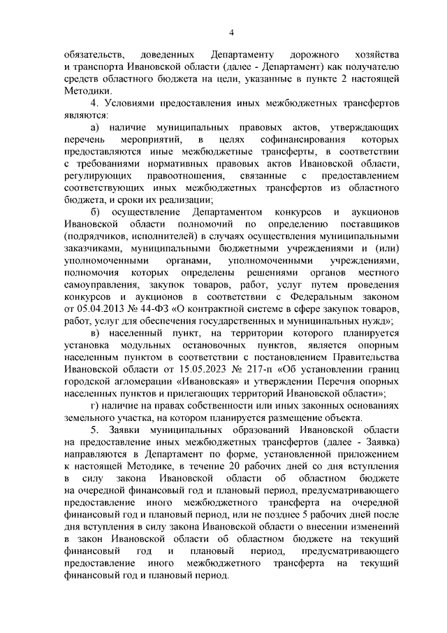 Постановление Правительства Ивановской области от 02.06.2025 N 202-п "О внесении изменений в постановление Правительства Ивановской области от 13.11.2013 N 447-п "Об утверждении государственной программы Ивановской области "Развитие транспортной системы Ивановской области" (вместе с "Методикой распределения и правилами предоставления иных межбюджетных трансфертов бюджетам муниципальных образований Ивановской области на приобретение и установку модульных остановочных пунктов")