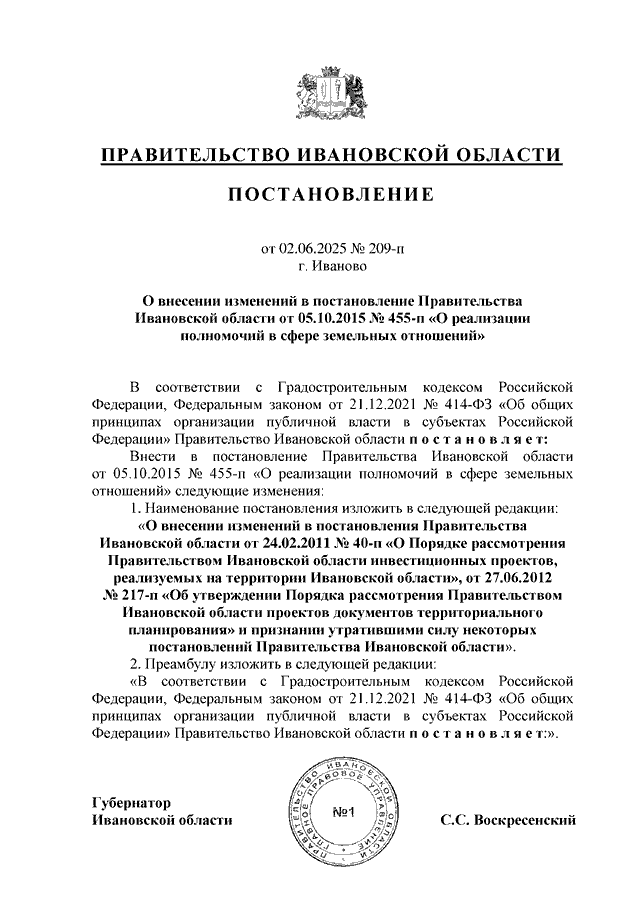 Постановление Правительства Ивановской области от 02.06.2025 N 209-п "О внесении изменений в постановление Правительства Ивановской области от 05.10.2015 N 455-п "О реализации полномочий в сфере земельных отношений"