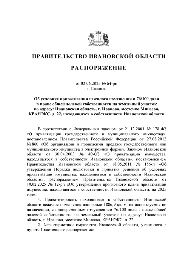 Распоряжение Правительства Ивановской области от 02.06.2025 N 64-рп "Об условиях приватизации нежилого помещения и 76/100 доли в праве общей долевой собственности на земельный участок по адресу: Ивановская область, г. Иваново, местечко Минеево, КРАНЭКС, д. 22, находящихся в собственности Ивановской области"