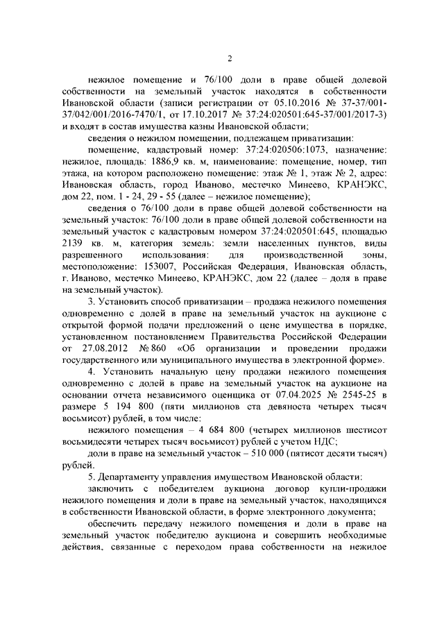 Распоряжение Правительства Ивановской области от 02.06.2025 N 64-рп "Об условиях приватизации нежилого помещения и 76/100 доли в праве общей долевой собственности на земельный участок по адресу: Ивановская область, г. Иваново, местечко Минеево, КРАНЭКС, д. 22, находящихся в собственности Ивановской области"