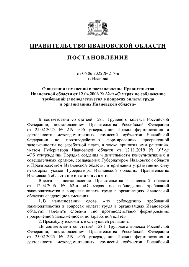 Постановление Правительства Ивановской области от 06.06.2025 N 217-п "О внесении изменений в постановление Правительства Ивановской области от 12.04.2006 N 62-п "О мерах по соблюдению требований законодательства в вопросах оплаты труда в организациях Ивановской области" (вместе с "Положением о межведомственной комиссии Ивановской области по противодействию формированию просроченной задолженности по заработной плате", "Перечнем муниципальных образований Ивановской области, на территориях которых создаются рабочие группы межведомственной комиссии Ивановской области по противодействию формированию просроченной задолженности по заработной плате, являющиеся ее неотъемлемой частью", "Положением о порядке создания и деятельности рабочих групп межведомственной комиссии Ивановской области по противодействию формированию просроченной задолженности по заработной плате на территориях муниципальных образований Ивановской области")