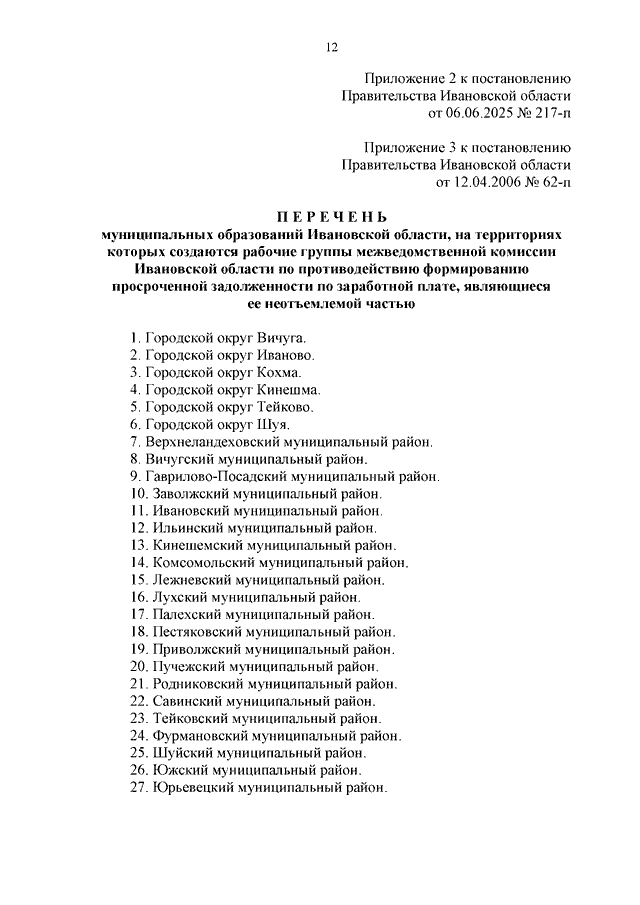 Постановление Правительства Ивановской области от 06.06.2025 N 217-п "О внесении изменений в постановление Правительства Ивановской области от 12.04.2006 N 62-п "О мерах по соблюдению требований законодательства в вопросах оплаты труда в организациях Ивановской области" (вместе с "Положением о межведомственной комиссии Ивановской области по противодействию формированию просроченной задолженности по заработной плате", "Перечнем муниципальных образований Ивановской области, на территориях которых создаются рабочие группы межведомственной комиссии Ивановской области по противодействию формированию просроченной задолженности по заработной плате, являющиеся ее неотъемлемой частью", "Положением о порядке создания и деятельности рабочих групп межведомственной комиссии Ивановской области по противодействию формированию просроченной задолженности по заработной плате на территориях муниципальных образований Ивановской области")