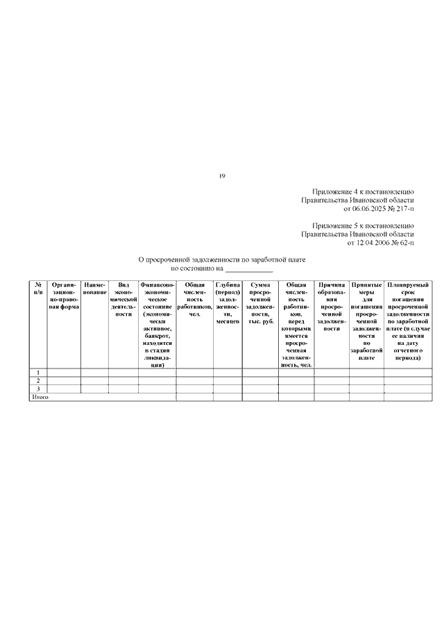 Постановление Правительства Ивановской области от 06.06.2025 N 217-п "О внесении изменений в постановление Правительства Ивановской области от 12.04.2006 N 62-п "О мерах по соблюдению требований законодательства в вопросах оплаты труда в организациях Ивановской области" (вместе с "Положением о межведомственной комиссии Ивановской области по противодействию формированию просроченной задолженности по заработной плате", "Перечнем муниципальных образований Ивановской области, на территориях которых создаются рабочие группы межведомственной комиссии Ивановской области по противодействию формированию просроченной задолженности по заработной плате, являющиеся ее неотъемлемой частью", "Положением о порядке создания и деятельности рабочих групп межведомственной комиссии Ивановской области по противодействию формированию просроченной задолженности по заработной плате на территориях муниципальных образований Ивановской области")