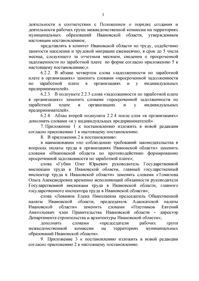 Постановление Правительства Ивановской области от 06.06.2025 N 217-п "О внесении изменений в постановление Правительства Ивановской области от 12.04.2006 N 62-п "О мерах по соблюдению требований законодательства в вопросах оплаты труда в организациях Ивановской области" (вместе с "Положением о межведомственной комиссии Ивановской области по противодействию формированию просроченной задолженности по заработной плате", "Перечнем муниципальных образований Ивановской области, на территориях которых создаются рабочие группы межведомственной комиссии Ивановской области по противодействию формированию просроченной задолженности по заработной плате, являющиеся ее неотъемлемой частью", "Положением о порядке создания и деятельности рабочих групп межведомственной комиссии Ивановской области по противодействию формированию просроченной задолженности по заработной плате на территориях муниципальных образований Ивановской области")