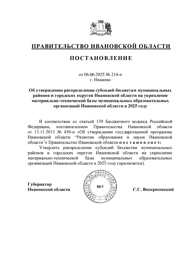 Постановление Правительства Ивановской области от 06.06.2025 N 214-п "Об утверждении распределения субсидий бюджетам муниципальных районов и городских округов Ивановской области на укрепление материально-технической базы муниципальных образовательных организаций Ивановской области в 2025 году"