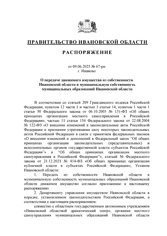 Распоряжение Правительства Ивановской области от 09.06.2025 N 67-рп "О передаче движимого имущества из собственности Ивановской области в муниципальную собственность муниципальных образований Ивановской области"