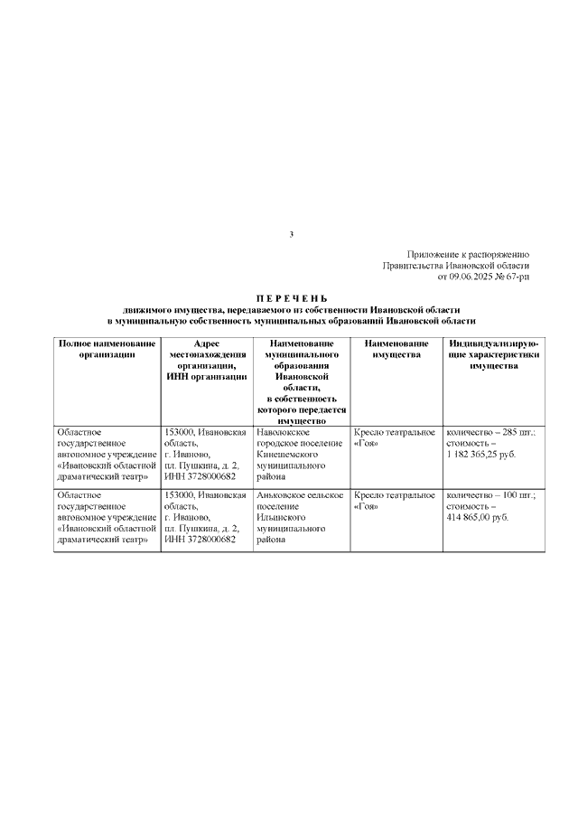 Распоряжение Правительства Ивановской области от 09.06.2025 N 67-рп "О передаче движимого имущества из собственности Ивановской области в муниципальную собственность муниципальных образований Ивановской области"