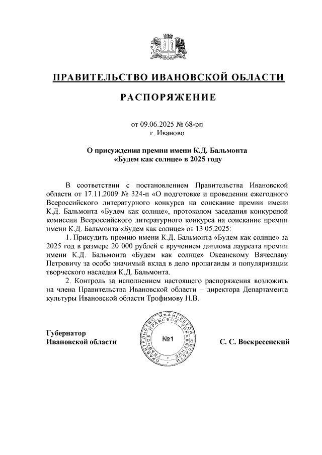Распоряжение Правительства Ивановской области от 09.06.2025 N 68-рп "О присуждении премии имени К.Д. Бальмонта "Будем как солнце" в 2025 году"
