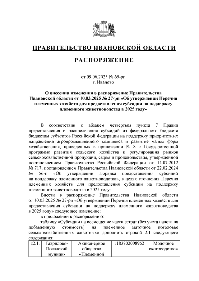 Распоряжение Правительства Ивановской области от 09.06.2025 N 69-рп "О внесении изменения в распоряжение Правительства Ивановской области от 10.03.2025 N 27-рп "Об утверждении Перечня племенных хозяйств для предоставления субсидии на поддержку племенного животноводства в 2025 году"