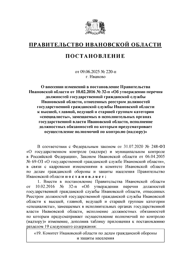 Постановление Правительства Ивановской области от 09.06.2025 N 220-п "О внесении изменений в постановление Правительства Ивановской области от 10.02.2016 N 32-п "Об утверждении перечня должностей государственной гражданской службы Ивановской области, отнесенных реестром должностей государственной гражданской службы Ивановской области к высшей, главной, ведущей и старшей группам категории "специалисты", замещаемых в исполнительных органах государственной власти Ивановской области, исполнение должностных обязанностей по которым предусматривает осуществление полномочий по контролю (надзору)"