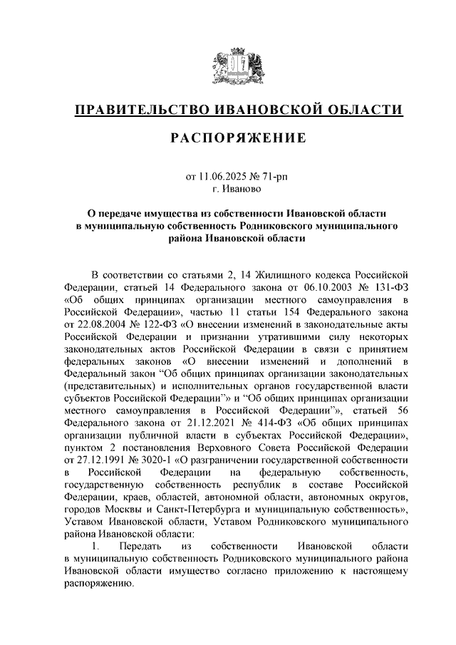 Распоряжение Правительства Ивановской области от 11.06.2025 N 71-рп "О передаче имущества из собственности Ивановской области в муниципальную собственность Родниковского муниципального района Ивановской области"