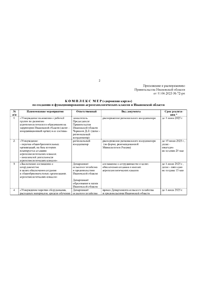 Распоряжение Правительства Ивановской области от 11.06.2025 N 72-рп "Об утверждении Комплекса мер ("дорожной карты") по созданию и функционированию агротехнологических классов в Ивановской области"