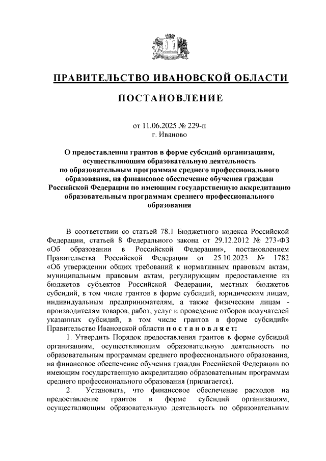 Постановление Правительства Ивановской области от 11.06.2025 N 229-п "О предоставлении грантов в форме субсидий организациям, осуществляющим образовательную деятельность по образовательным программам среднего профессионального образования, на финансовое обеспечение обучения граждан Российской Федерации по имеющим государственную аккредитацию образовательным программам среднего профессионального образования" (вместе с "Порядком предоставления грантов в форме субсидий организациям, осуществляющим образовательную деятельность по образовательным программам среднего профессионального образования, на финансовое обеспечение обучения граждан Российской Федерации по имеющим государственную аккредитацию образовательным программам среднего профессионального образования")