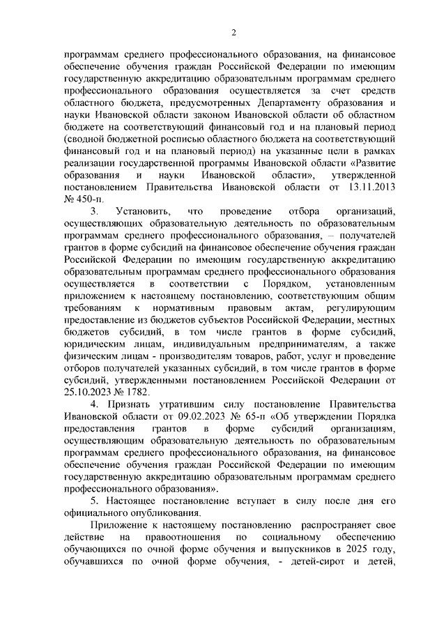 Постановление Правительства Ивановской области от 11.06.2025 N 229-п "О предоставлении грантов в форме субсидий организациям, осуществляющим образовательную деятельность по образовательным программам среднего профессионального образования, на финансовое обеспечение обучения граждан Российской Федерации по имеющим государственную аккредитацию образовательным программам среднего профессионального образования" (вместе с "Порядком предоставления грантов в форме субсидий организациям, осуществляющим образовательную деятельность по образовательным программам среднего профессионального образования, на финансовое обеспечение обучения граждан Российской Федерации по имеющим государственную аккредитацию образовательным программам среднего профессионального образования")