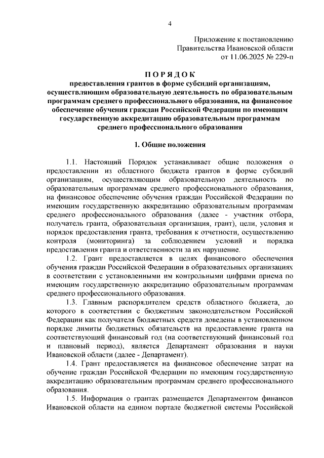 Постановление Правительства Ивановской области от 11.06.2025 N 229-п "О предоставлении грантов в форме субсидий организациям, осуществляющим образовательную деятельность по образовательным программам среднего профессионального образования, на финансовое обеспечение обучения граждан Российской Федерации по имеющим государственную аккредитацию образовательным программам среднего профессионального образования" (вместе с "Порядком предоставления грантов в форме субсидий организациям, осуществляющим образовательную деятельность по образовательным программам среднего профессионального образования, на финансовое обеспечение обучения граждан Российской Федерации по имеющим государственную аккредитацию образовательным программам среднего профессионального образования")