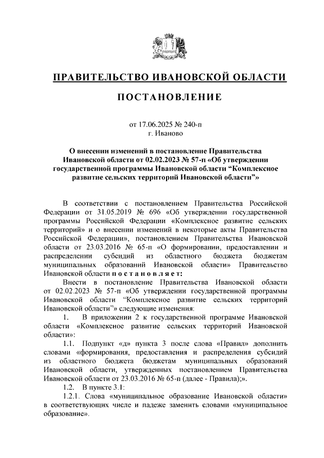 Постановление Правительства Ивановской области от 17.06.2025 N 240-п "О внесении изменений в постановление Правительства Ивановской области от 02.02.2023 N 57-п "Об утверждении государственной программы Ивановской области "Комплексное развитие сельских территорий Ивановской области"