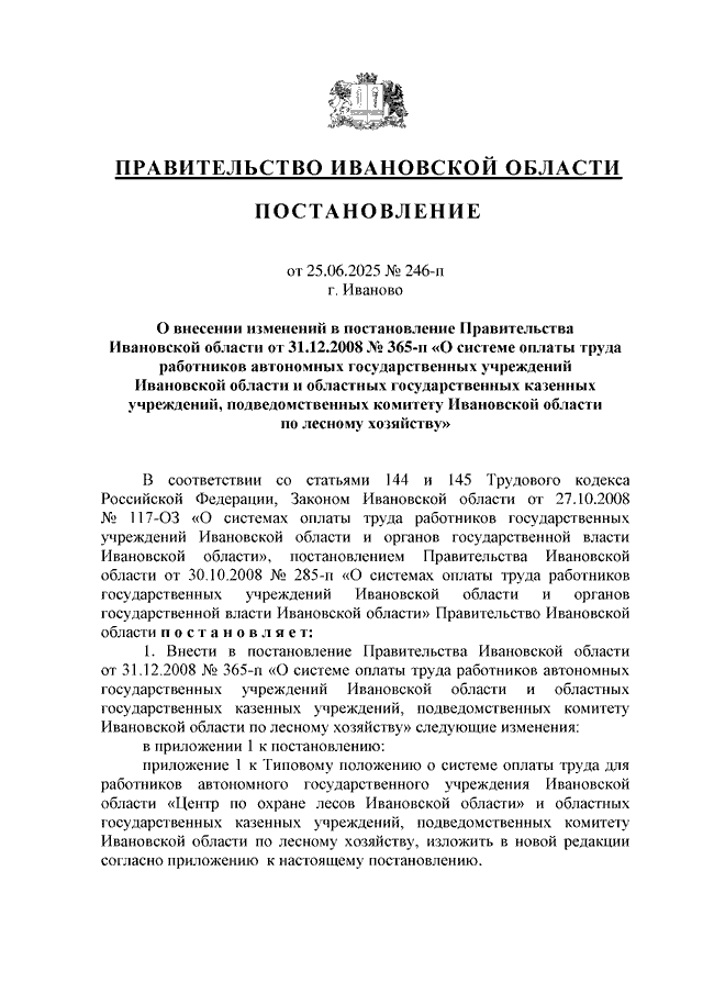 Постановление Правительства Ивановской области от 25.06.2025 N 246-п "О внесении изменений в постановление Правительства Ивановской области от 31.12.2008 N 365-п "О системе оплаты труда работников автономных государственных учреждений Ивановской области и областных государственных казенных учреждений, подведомственных комитету Ивановской области по лесному хозяйству"