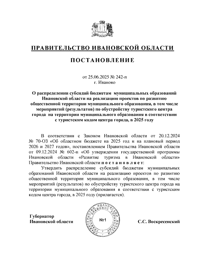 Постановление Правительства Ивановской области от 25.06.2025 N 242-п "О распределении субсидий бюджетам муниципальных образований Ивановской области на реализацию проектов по развитию общественной территории муниципального образования, в том числе мероприятий (результатов) по обустройству туристского центра города на территории муниципального образования в соответствии с туристским кодом центра города, в 2025 году"