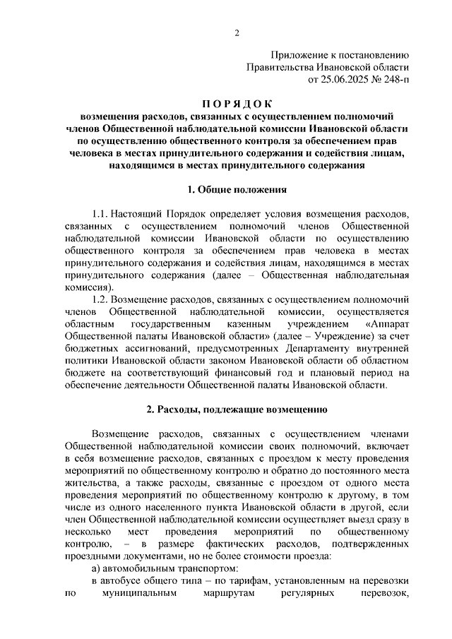 Постановление Правительства Ивановской области от 25.06.2025 N 248-п "Об утверждении Порядка возмещения расходов, связанных с осуществлением полномочий членов Общественной наблюдательной комиссии Ивановской области по осуществлению общественного контроля за обеспечением прав человека в местах принудительного содержания и содействия лицам, находящимся в местах принудительного содержания"