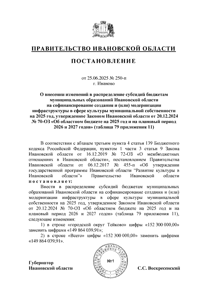 Постановление Правительства Ивановской области от 25.06.2025 N 250-п "О внесении изменений в распределение субсидий бюджетам муниципальных образований Ивановской области на софинансирование создания и (или) модернизации инфраструктуры в сфере культуры муниципальной собственности на 2025 год, утвержденное Законом Ивановской области от 20.12.2024 N 70-ОЗ "Об областном бюджете на 2025 год и на плановый период 2026 и 2027 годов" (таблица 79 приложения 11)"