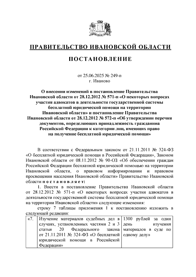 Постановление Правительства Ивановской области от 25.06.2025 N 249-п "О внесении изменений в постановление Правительства Ивановской области от 28.12.2012 N 571-п "О некоторых вопросах участия адвокатов в деятельности государственной системы бесплатной юридической помощи на территории Ивановской области" и постановление Правительства Ивановской области от 28.12.2012 N 572-п "Об утверждении перечня документов, определяющих принадлежность гражданина Российской Федерации к категории лиц, имеющих право на получение бесплатной юридической помощи"
