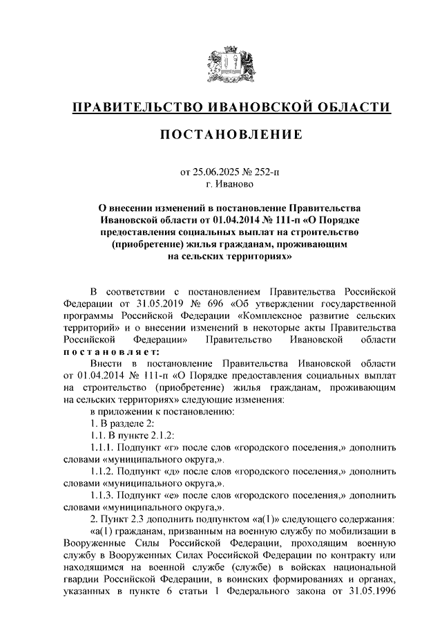 Постановление Правительства Ивановской области от 25.06.2025 N 252-п "О внесении изменений в постановление Правительства Ивановской области от 01.04.2014 N 111-п "О Порядке предоставления социальных выплат на строительство (приобретение) жилья гражданам, проживающим на сельских территориях"