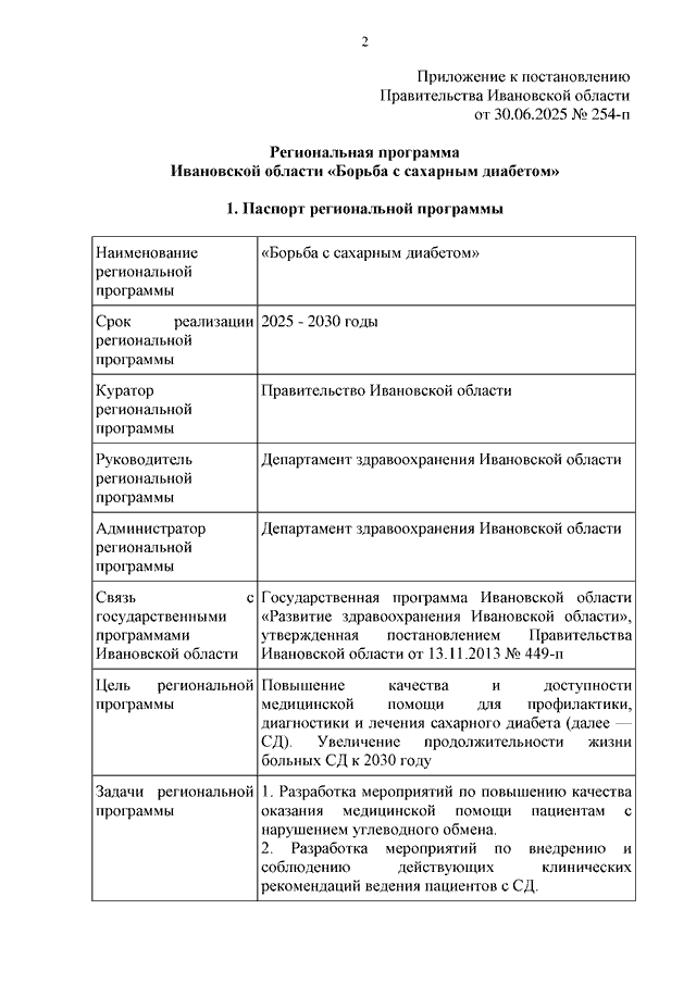 Постановление Правительства Ивановской области от 30.06.2025 N 254-п "Об утверждении региональной программы Ивановской области "Борьба с сахарным диабетом"