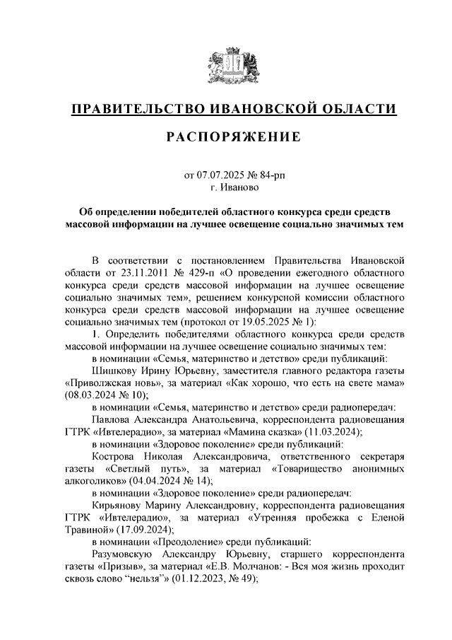 Распоряжение Правительства Ивановской области от 07.07.2025 N 84-рп "Об определении победителей областного конкурса среди средств массовой информации на лучшее освещение социально значимых тем"