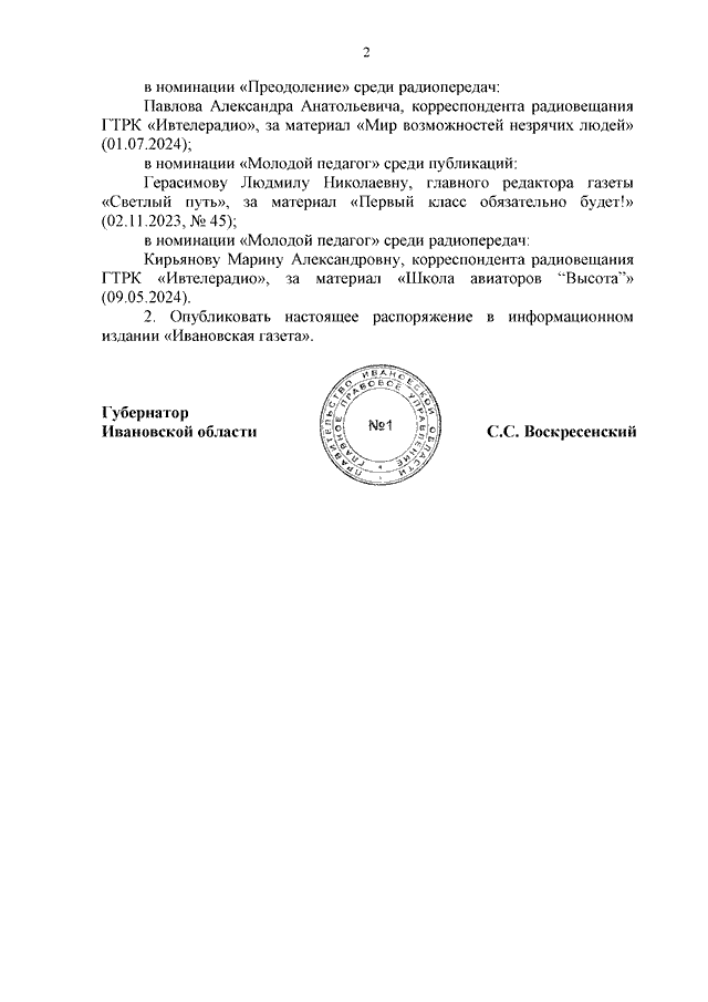 Распоряжение Правительства Ивановской области от 07.07.2025 N 84-рп "Об определении победителей областного конкурса среди средств массовой информации на лучшее освещение социально значимых тем"