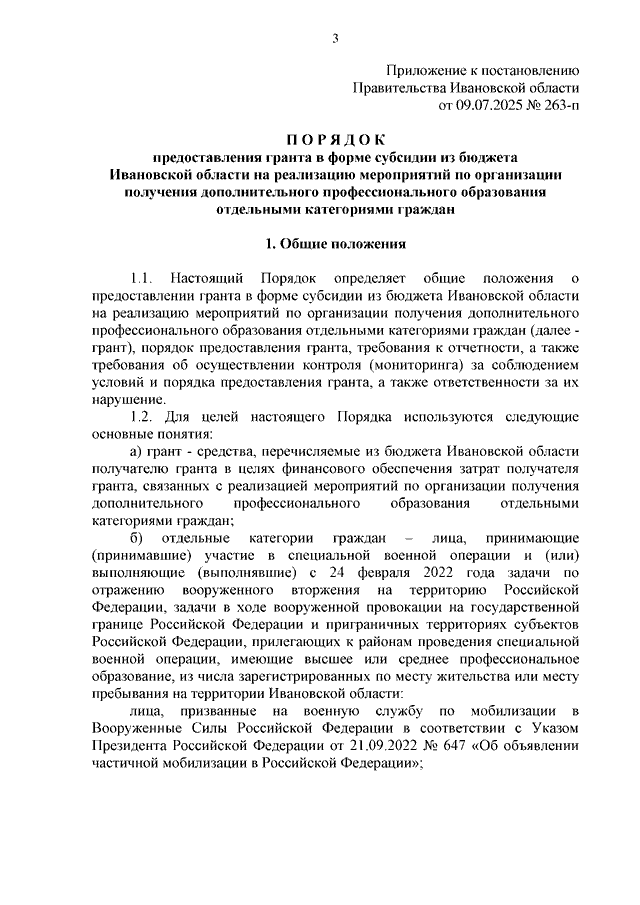 Постановление Правительства Ивановской области от 09.07.2025 N 263-п "Об утверждении Порядка предоставления гранта в форме субсидии из бюджета Ивановской области на реализацию мероприятий по организации получения дополнительного профессионального образования отдельными категориями граждан"