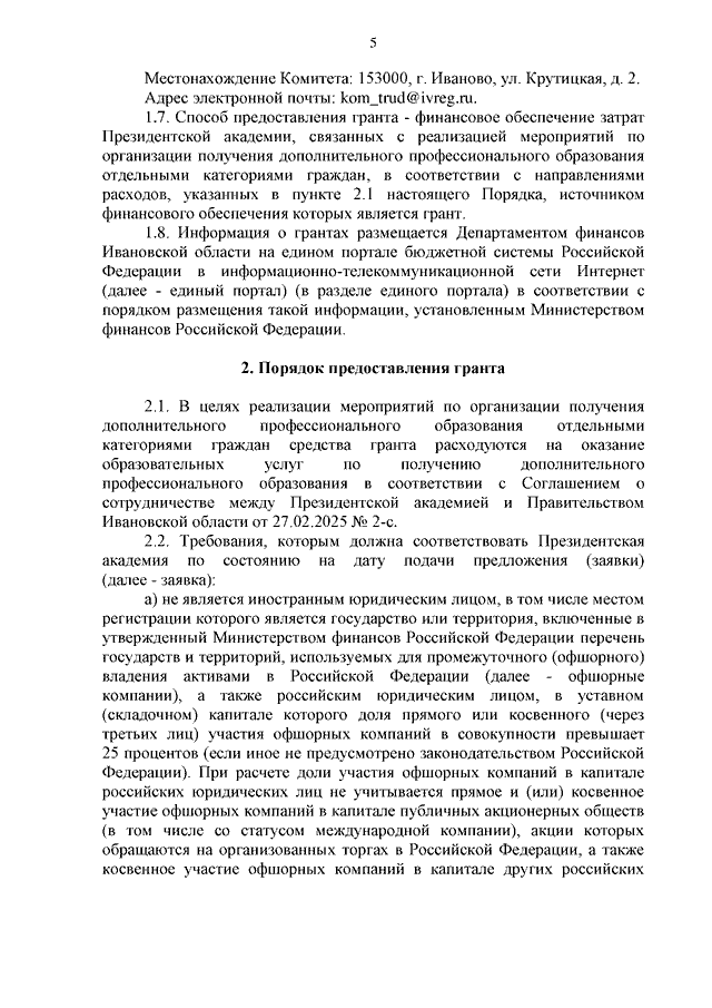 Постановление Правительства Ивановской области от 09.07.2025 N 263-п "Об утверждении Порядка предоставления гранта в форме субсидии из бюджета Ивановской области на реализацию мероприятий по организации получения дополнительного профессионального образования отдельными категориями граждан"