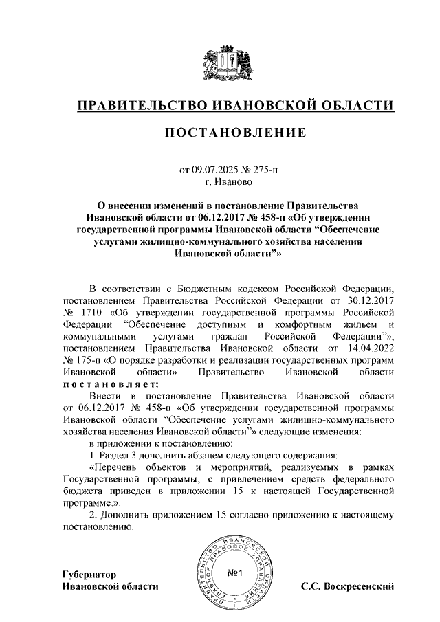 Постановление Правительства Ивановской области от 09.07.2025 N 275-п "О внесении изменений в постановление Правительства Ивановской области от 06.12.2017 N 458-п "Об утверждении государственной программы Ивановской области "Обеспечение услугами жилищно-коммунального хозяйства населения Ивановской области" (вместе с "Перечнем объектов и мероприятий, реализуемых в рамках государственной программы Ивановской области, с привлечением средств федерального бюджета")
