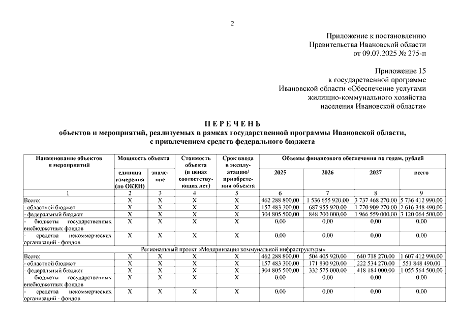 Постановление Правительства Ивановской области от 09.07.2025 N 275-п "О внесении изменений в постановление Правительства Ивановской области от 06.12.2017 N 458-п "Об утверждении государственной программы Ивановской области "Обеспечение услугами жилищно-коммунального хозяйства населения Ивановской области" (вместе с "Перечнем объектов и мероприятий, реализуемых в рамках государственной программы Ивановской области, с привлечением средств федерального бюджета")